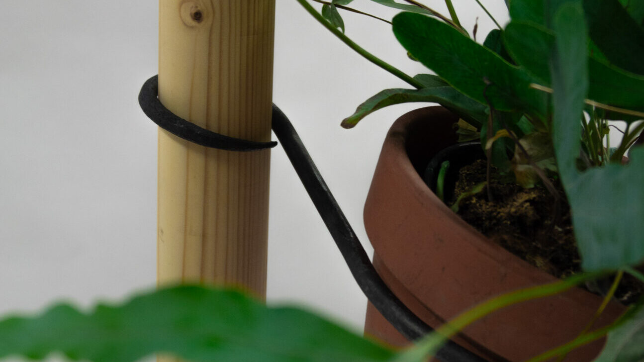 Die Topfhalterungen habe ich von Hand geschmiedet. Sie halten sich durch das Topfgewicht selbst am Rundstab und können einfach verschoben werden, indem man sie anhebt. So können die Pflanzen auch einfach für ihre individuellen Lichtbedürfnisse verschoben werden.