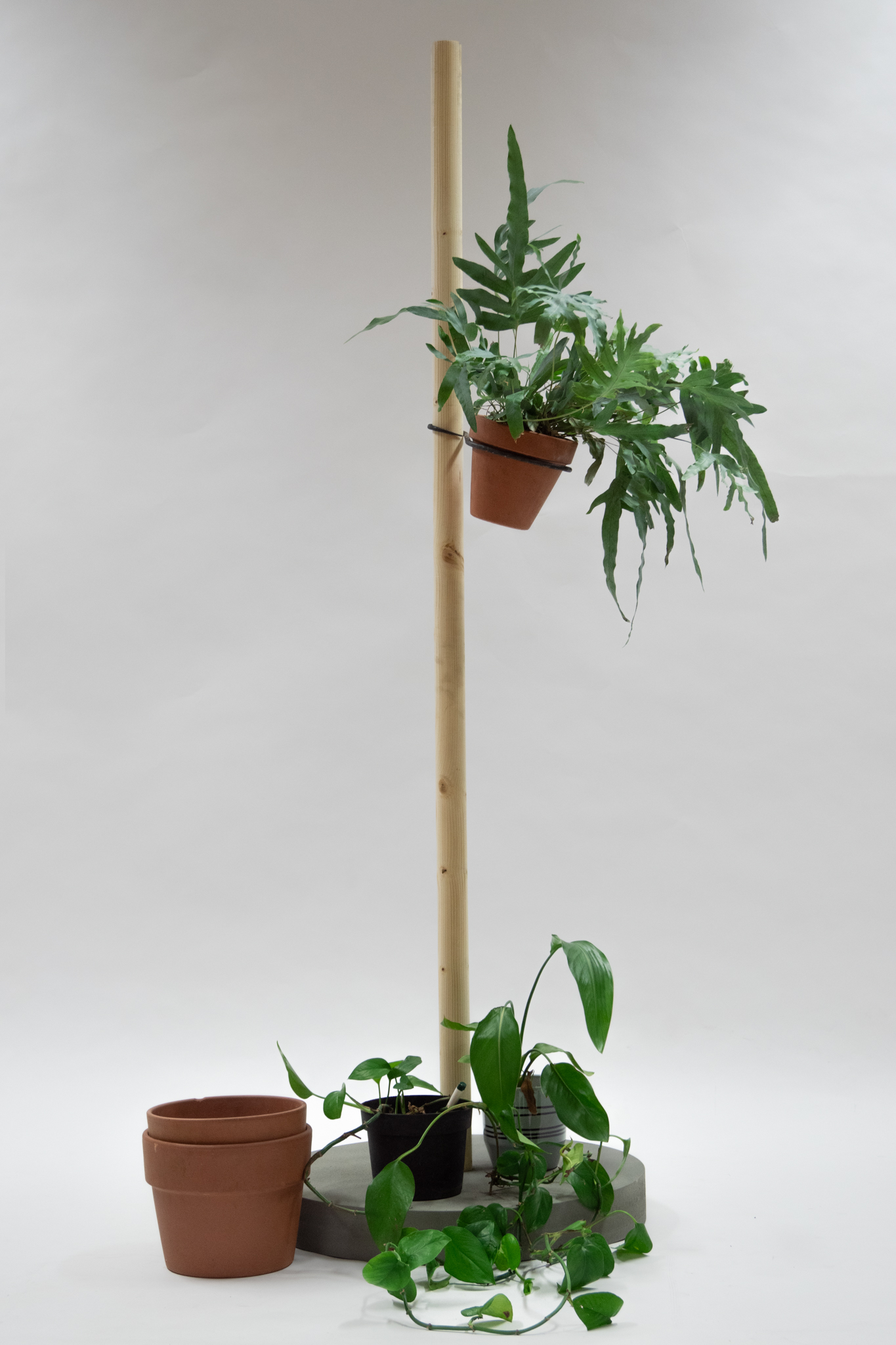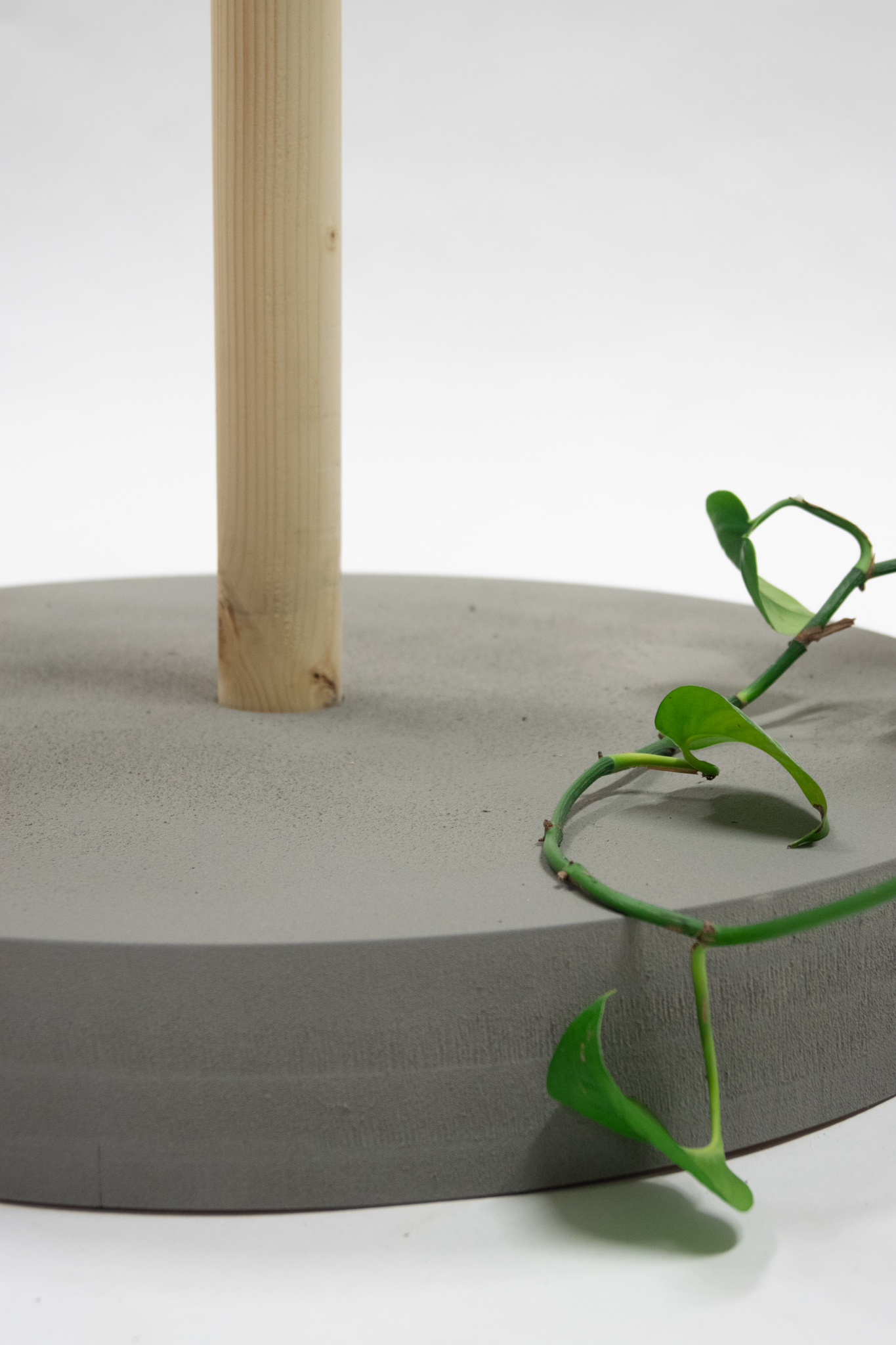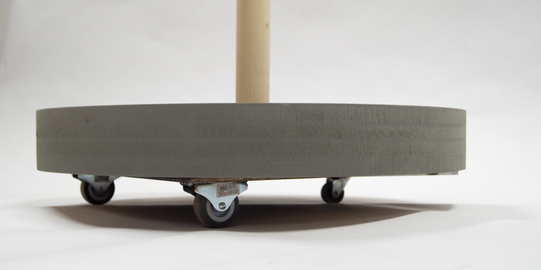 In der Recherche habe ich mich dazu entschieden, dass der Ständer mobil werden sollte, damit er z.B. beim Saugen einfach zur Seite geschoben werden kann. Ein weiterer Gedanke war, dass der Ständer so zwischen den Jahreszeiten von draußen nach drinnen (und andersrum) gerollt werden kann. Die Rollen sind nun so angebracht, dass sie erst sichtbar werden, wenn der Sockel angehoben wird. Dieser besteht übrigens aus MDF und wurde nur in Beton-Optok lackiert, damit er nicht zu schwer wird.